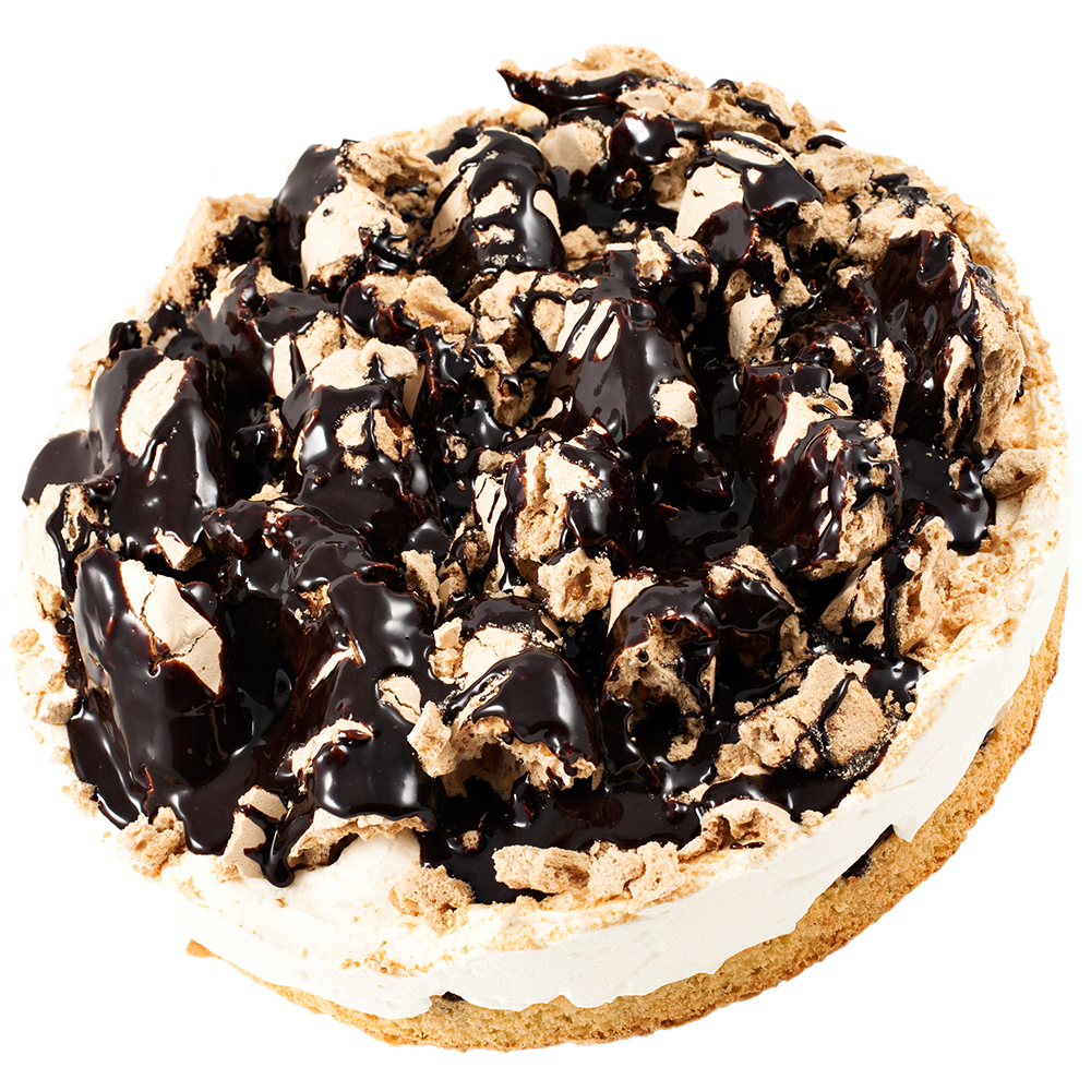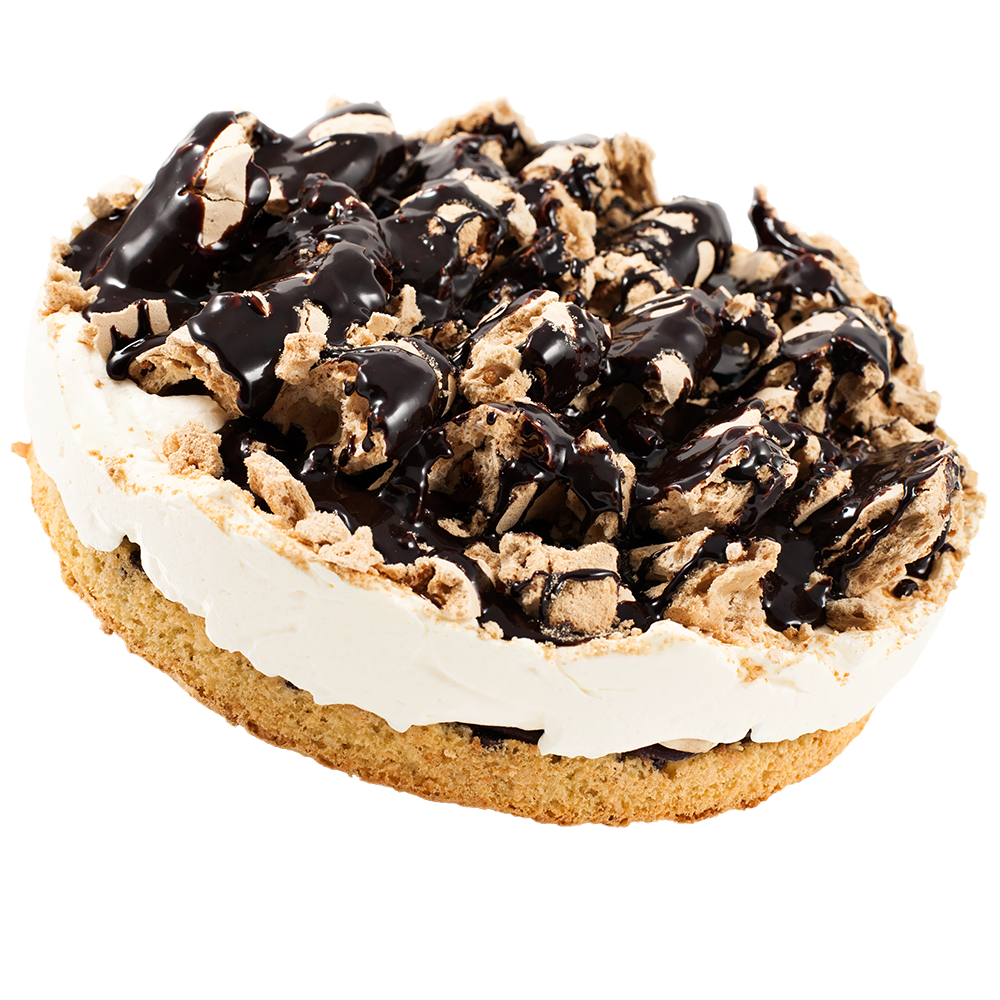 15 manna bragðgóð marengsterta sem er í senn stökk og mjúk. Mýktin kemur úr kókossvampbotni með súkkulaði, rjóma og banönum en stökki hlutinn inniheldur mulinn púðursykurmarengs með súkkkulaðiganas.