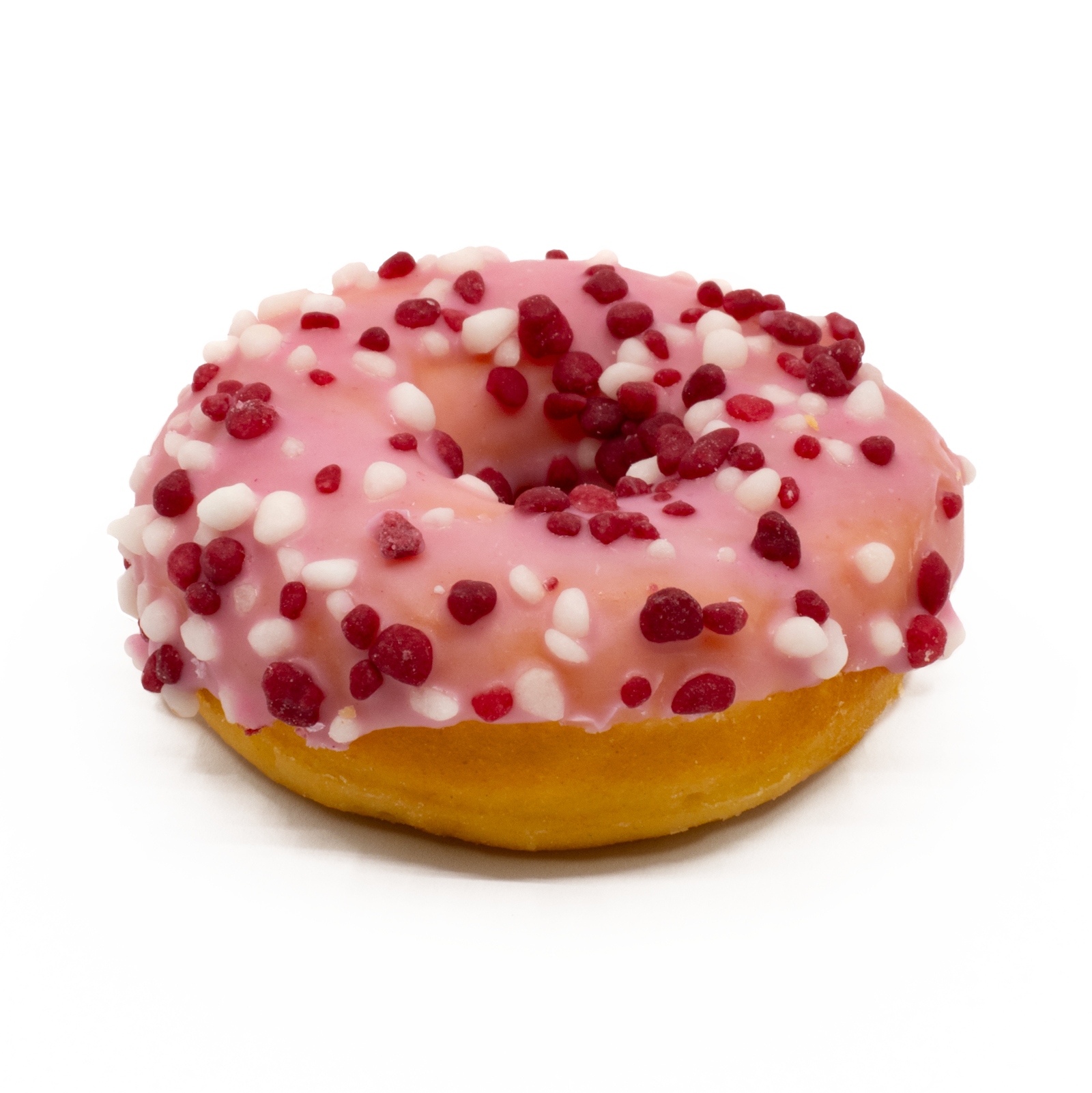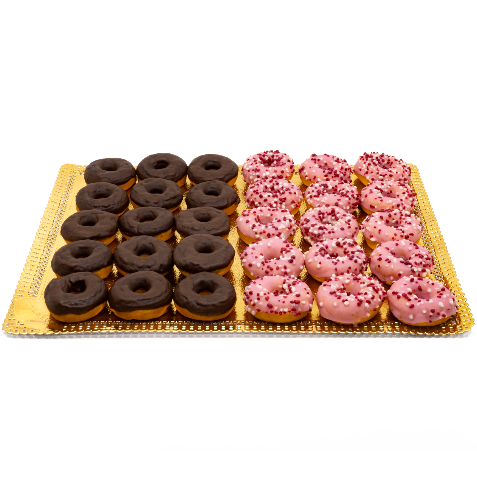 Gómsætir litlir kleinuhringir, 15 stk. með súkkulaði og 15 stk. fallega bleikir með jarðaberja sykurperlum. Það eru 30 sætir kleinuhringir saman á bakka.